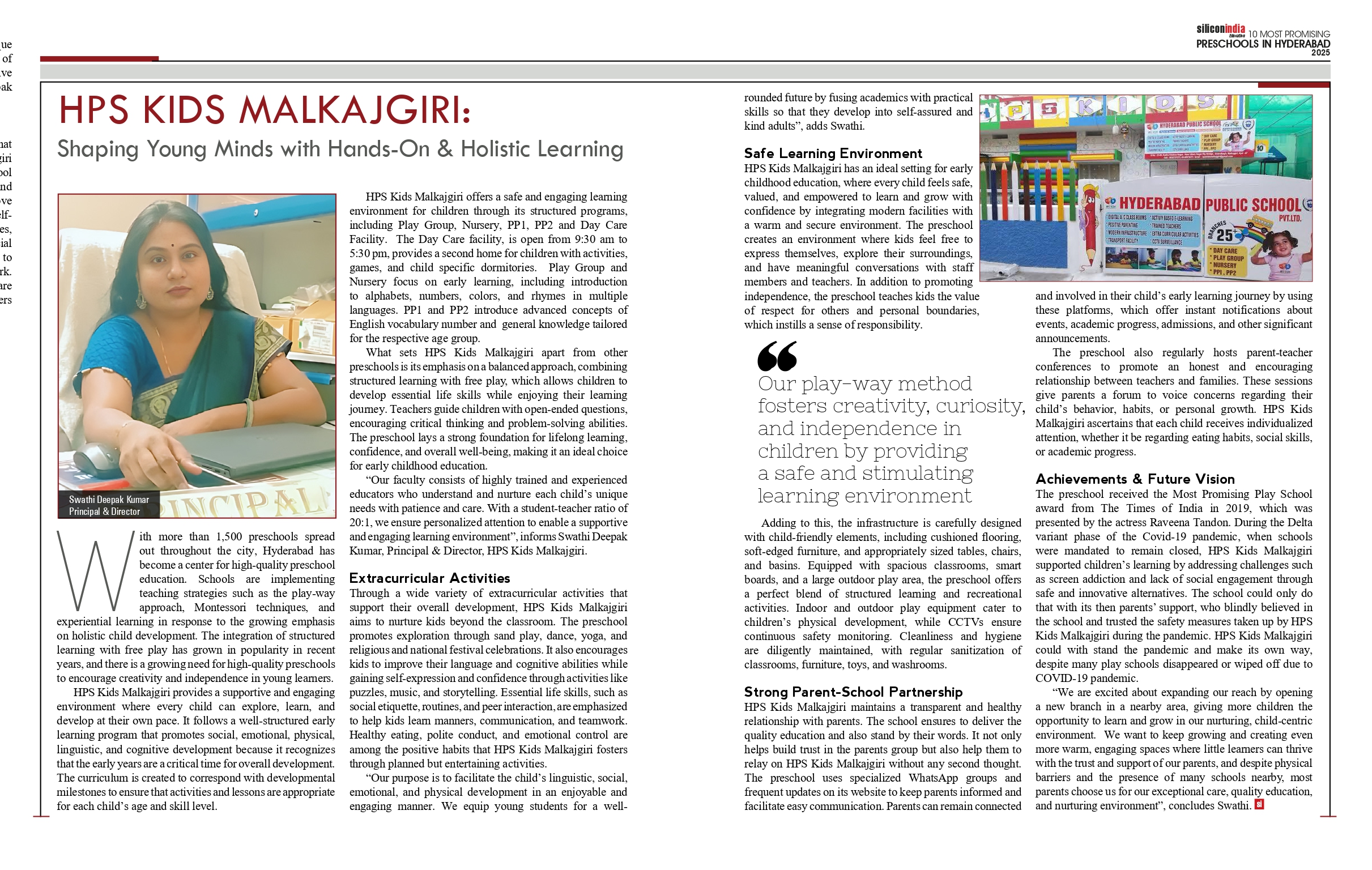 HPS is recognized as one of the top 10 preschools in Hyderabad - 2025